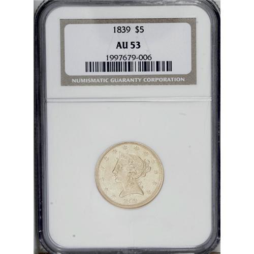 <B>1839<$5> AU53 NGC.</B></I> 1839-dated half eagles constitute a little-known single year type, since the portrait was further tinkered with by Gobrecht for the 1840-dated issues. Liberty has a sleepy-eyed appearance on the present piece, which is crisply struck, subdued, and free from obtrusive marks.
