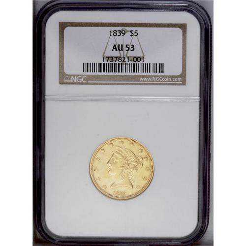 <B>1839<$5> AU53 NGC.</B></I> The 1839 is a little-discussed single-year subtype. The portrait of Liberty is sleepy-eyed, and differs noticeably from her more alert appearance on subsequent dates. This partly lustrous piece is boldly struck, and clean despite a few faint marks near the profile.
