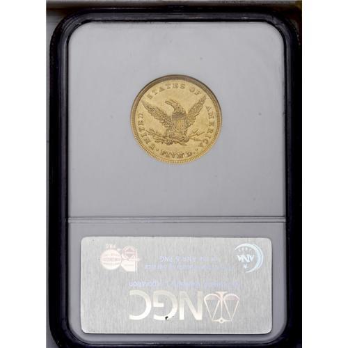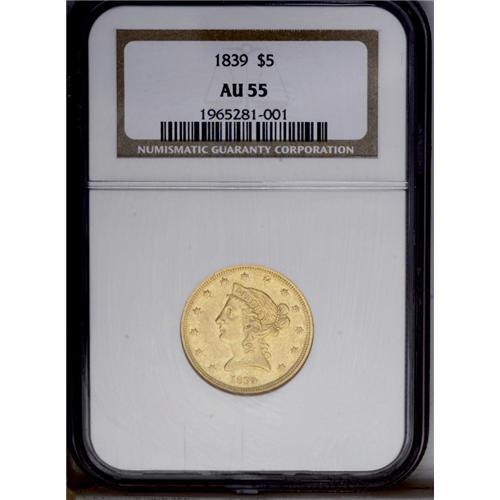 <B>1839<$5> AU55 NGC.</B></I> Well struck except for a few star centers, and the only apparent marks are on the obverse rim at 10:30 and on the reverse near 5:30. This scarce date is also noteworthy for the portrait style, which differs in subtle ways from the more familiar Liberty head on the 1840 and later issues. <BR><BR><B>Important notice:</B> Heritage usually auctions material at the rate of 200-250 lots per hour. On some occasions eBay Live bid software or the Internet may not be able to keep up with the pace of the auction. We recommend placing a realistic absentee bid now as insurance to avoid disappointment. Occasionally the auctioneer may eliminate or reject an eBay Live bid, and the auctioneer may also reopen a lot after the close of the eBay live bidding (usually because we missed an audience bid), and may reject your bid even if it shows you as the winning bidder. By bidding via eBay Live, you agree that Heritage may award the lot to another bidder at its sole discretion under the circumstances described above or any other reasonable circumstances. Since eBay bids are not shown to us until we open the lot on the floor, we treat those bids just like floor bids. In most cases the floor responds before the eBay bid is presented to us, due to Internet lag time, so for consistency we have made it a policy that floor bids are always considered first over tie eBay live bids. Also please note that all Heritage lots purchased through eBay Live carry a 20% Buyer's Premium. Please make sure you read the Terms and Conditions before you bid. This lot is being auctioned in conjunction with a live floor auction by Heritage Galleries & Auctioneers. All final auction and invoice information will be supplied by Heritage Galleries & Auctioneers, and all other information should be considered preliminary. Lot:2651 <BR><BR><B>Winning Notification and Billing:</B> After the FINAL session in this auction is complete, Heritage will send e-mail and snail mail invoices. This process normally takes several days. All final auction and invoice information will be supplied by Heritage Galleries & Auctioneers, and all other information should be considered preliminary. <BR><BR>This auction will be conducted on a live auction floor and over the Internet through eBay Live. If you choose to place an absentee bid, please take a moment to <font color='#0000ff'><u><a href='http://pages.ebay.com/liveauctions/help/before/laabsentee.html'>learn how eBay Live absentee bidding works</a></u></font><font color='#000000'>