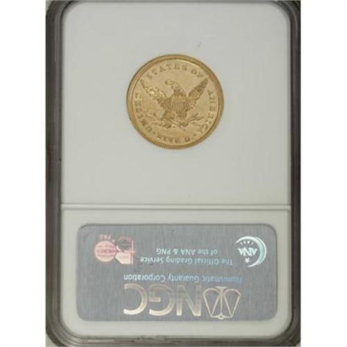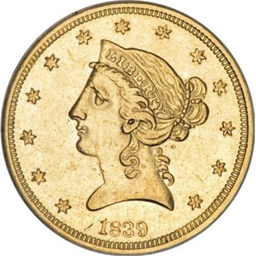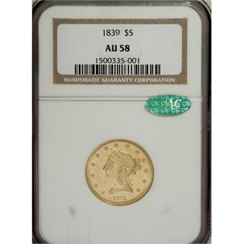 <B>1839 $5 AU58 NGC. CAC.</B></I> The Mint first struck Christian Gobrecht's half eagle in 1839. The Liberty Head type, also known as the Coronet or Braided Hair type, became one of the most stable designs of the 19th century. The obverse of this coin did not change for 70 years. The reverse remained essentially unchanged for that entire time. The most significant change the Mint made was to add IN GOD WE TRUST on a scroll. The 1839 is scarce in AU condition, with very few know in Mint State condition. Sharply struck throughout, the surfaces are lightly but extensively abraded but the only mark of singular note is a shallow scratch connecting the stars above Liberty's head. Bright yellow-gold color. NGC has graded 31 pieces in AU58, with 38 finer (3/08).<BR><BR><B>Coin Engraver:</B> Christian Gobrecht<BR><BR><b>Shipping:</b> Coins & Currency (<a target="_blank" href="http://www.heritageauctions.com/common/shipping.php">view shipping information</a>)