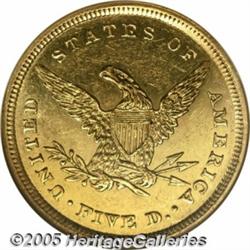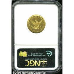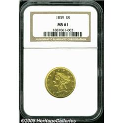<B>1839 $5 MS61 NGC.</B></I> First year of the modified design by Christian Gobrecht. While many first year type coins were saved at the time of issue, there was almost no collector base in this country in 1839 that collected each date and mintmark in a given series. As a result, the survival of coins such as the 1839 Half Eagle was more a matter of chance than design. This is a charming example that has greater eye appeal than its grade would indicate. The green-gold surfaces are lustrous and peppered with only slight abrasions, and the striking details are uncommonly bold, save for the peripheral stars on the obverse.<BR><I>From The Richard J. Chouinard Collection of United States Coins, Part Three.</B></I>
