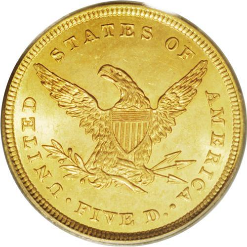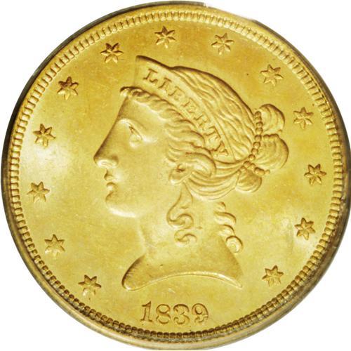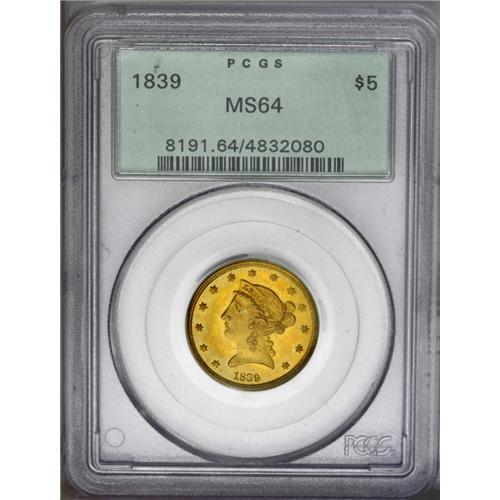 <B>1839<$5> MS64 PCGS.</B></I> First year of the new design half eagle created by Christian Gobrecht, and relatively common in circulated grades. Gobrecht's design became a staple of American commerce, being utilized on quarter eagles from 1840 to 1907, half eagles from 1839 to 1908, and eagles from 1838 to 1907. This example is almost certainly one of the finest known business strikes (two proofs are known), and it is the only example of this grade certified by PCGS with none finer. David Akers commented that "high grade specimens, i.e. coins grading AU or Unc., are very rare and choice Mint State pieces are virtually unobtainable." This commentary is equally appropriate today as it was when his words were written in 1979. There are possibly five or six examples that are comparable to this specimen.<BR> This example is sharply detailed with every design element on each side fully defined, except for stars 1 through 5. A few minor contact marks are evident, along with a small luster break just inside star 12. Both sides have frosty luster with brilliant yellow-gold surfaces, the obverse with tinges of peripheral blue color. The reverse is a shade darker than the obverse with lovely honey-colored gold.<BR> A raised dot on Liberty's neck is common to every known example of this issue. In days gone by, some examples of this issue have been cataloged as 1839/8 overdates, yet such an overdate is highly illogical, and clearly does not exist, in our opinion. With the single exception of the 1796/5 overdate half dime, there are no known overdate varieties of the first year for a new design. For the technically minded collector, it is important to realized that this is not only the first year of a new major design, but it is a one-year type coin, as the head of Liberty was slightly modified in 1840. This issue is also representative of the broad mill coinage of Liberty half eagle <BR><BR><B>Importa