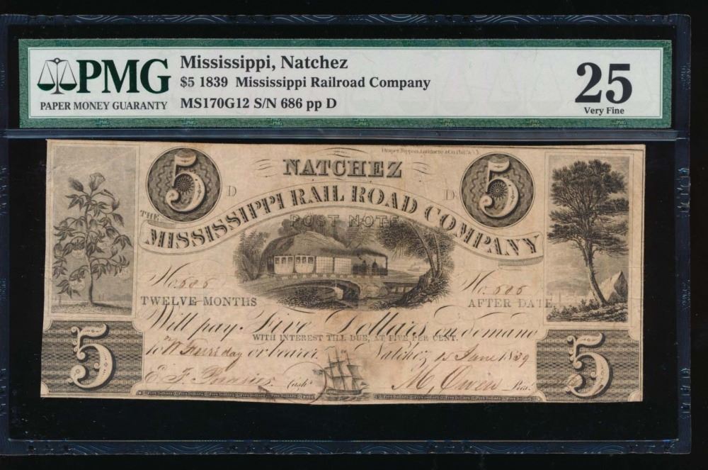 One 1839 $5 Mississippi Railroad Company Obsolete Note PMG 25.