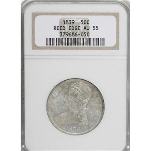 <B>1839 50C Reeded Edge AU55 NGC.</B></I> Traces of luster reside in the recessed areas of this Choice AU half dollar. Silver-gray surfaces are devoid of significant marks, and exhibit well impressed design elements.<BR><BR><B>Coin Engraver:</B> Christian Gobrecht<BR><BR><b>Shipping:</b> Coins & Currency (<a target="_blank" href="http://www.heritageauctions.com/common/shipping.php">view shipping information</a>)