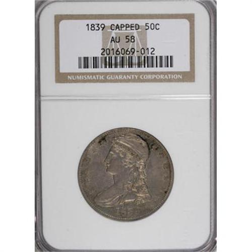 <B>1839 50C AU58 NGC.</B></I> NGC Census: (67/107). PCGS Population (32/95). Mintage: 1,392,976. Numismedia Wsl. Price for NGC/PCGS coin in AU58: $675. (#6179)<BR><BR><B>Coin Engraver:</B> Christian Gobrecht<BR><BR><b>Shipping:</b> Coins & Currency (<a target="_blank" href="http://www.heritageauctions.com/common/shipping.php">view shipping information</a>)