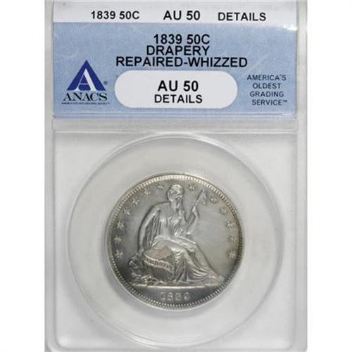 <B>1839 50C Drapery--Repaired, Whizzed--ANACS AU50 Details.</B></I> NGC Census: (8/74). PCGS Population (12/72). Mintage: 1,872,400. Numismedia Wsl. Price for NGC/PCGS coin in AU50: $225. (#6232)<BR><BR><B>Coin Engraver:</B> Christian Gobrecht<BR><BR><b>Shipping:</b> Coins & Currency (<a target="_blank" href="http://www.heritageauctions.com/common/shipping.php">view shipping information</a>)