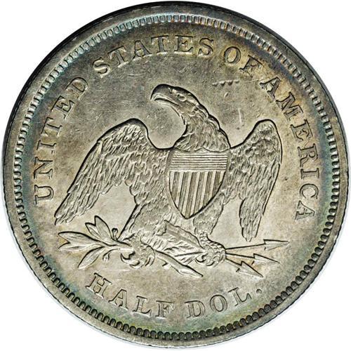 <B>1839<50C> Drapery AU55 NGC.</B></I> 1839 was the first year of the Seated Half design, and drapery was added beneath the elbow after about half of the annual mintage had been struck. The No Drapery pieces are not particularly scarcer, but are popular as a separate design type. This makes the nearly equally elusive Drapery examples the better value, and despite a high mintage, the 1839 Drapery is difficult to find in better circulated grades. The present piece possesses medium apricot and blue-green color, and the crisply impressed devices exhibit ample shimmering luster. A few minor field marks are not of importance.