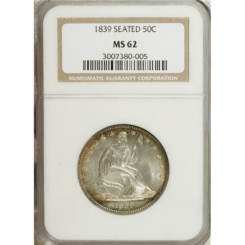 <B>1839 50C Drapery MS62 NGC.</B></I> The With Drapery halves were allegedly struck in August 1839. Unlike most halves of this issue, this piece shows strong striking details. The fields are prooflike, as usual, and both sides are brilliant with a thin ring of golden-brown around the margins.<BR><BR><b>Shipping:</b> Coins & Currency (<a target="_blank" href="http://www.heritageauctions.com/common/shipping.php">view shipping information</a>)