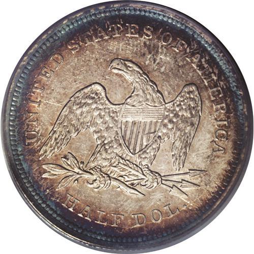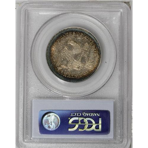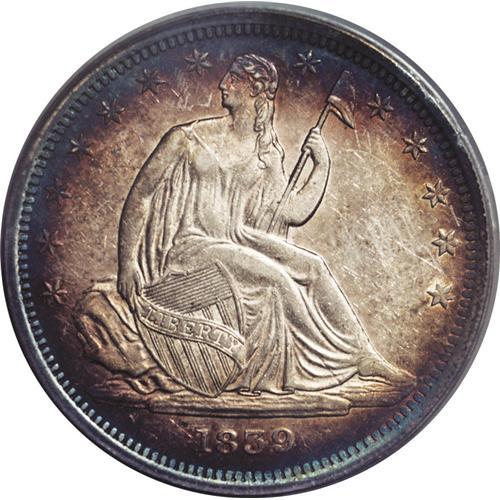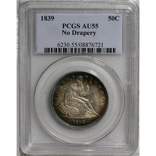 <B>1839<50C> No Drapery AU55 PCGS.</B></I> A trace of highpoint wear precludes Mint State status, though the coin still retains much of its original luster. Nicely struck and toned violet and orange at the periphery. Great overall eye appeal, though a few handling marks appear in the fields.