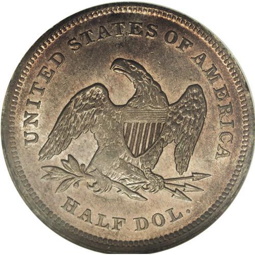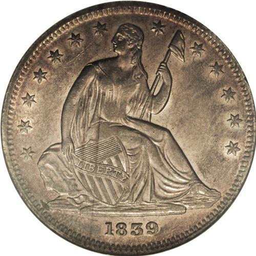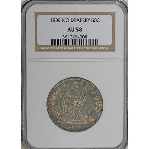 <B>1839 50C No Drapery AU58 NGC.</B></I> A quite lustrous example with rose and gold joining slate-gray in the patina. The obverse and reverse both have light friction, though the friction blends in with a weak strike on the eagle's leg on the reverse. A pretty example with nice eye appeal. Census: 29 in 58, 19 finer (11/06).<BR><BR><b>Shipping:</b> Coin/Currency (<a target="_blank" href="http://www.heritageauctions.com/common/shipping.php">view shipping information</a>)