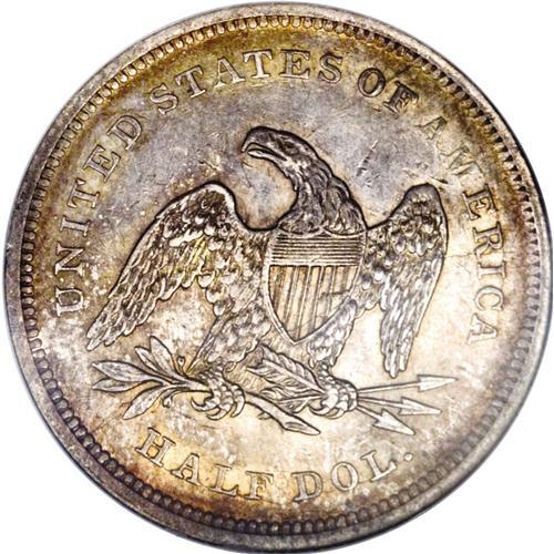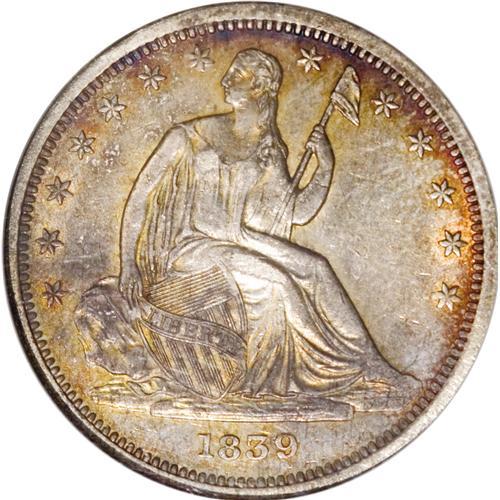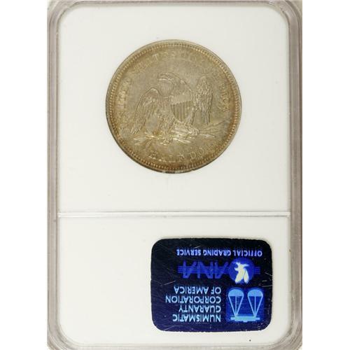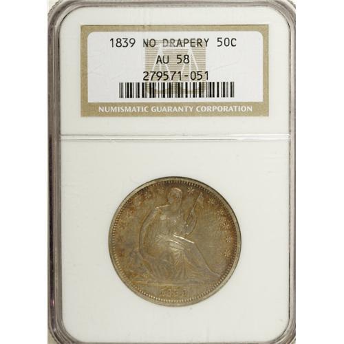 <B>1839 50C No Drapery AU58 NGC.</B></I> WB-101. Extensive reverse die cracks show on this coin, from the same die used to strike the "so-called proofs" of this issue, as Wiley and Bugert phrase it. A crack runs from left of the H in HALF counterclockwise to the E in AMERICA, while a second joins the rim with the nearby olive leaf, continuing upward onto the shield and through the right (facing) wing to the R in AMERICA. Much luster remains despite the slight rub, with copper-gold toning. Census: 29 in 58, 19 finer (12/06).<BR><BR><b>Shipping:</b> Coin/Currency (<a target="_blank" href="http://www.heritageauctions.com/common/shipping.php">view shipping information</a>)
