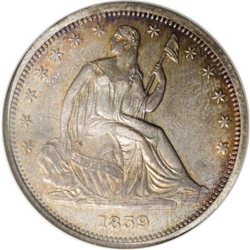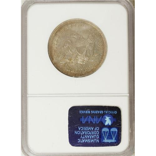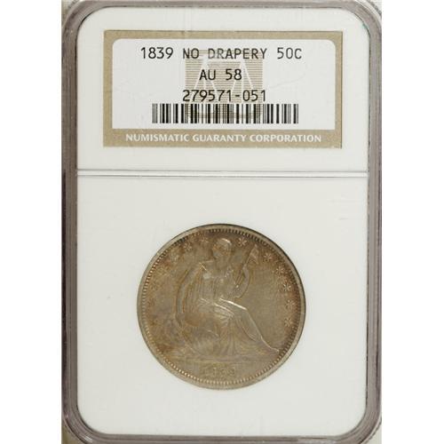 <B>1839 50C No Drapery AU58 NGC.</B></I> WB-101. Extensive reverse die cracks show on this coin, from the same die used to strike the "so-called proofs" of this issue, as Randy Wiley and Bill Bugert (1993) phrase it. A crack runs from left of the H in HALF counterclockwise to the M in AMERICA, while a second joins the rim with the nearby olive leaf, continuing upward onto the shield and through the right (facing) wing to the R in AMERICA. The authors state: "Coins with this last cracked reverse are very scarce." More on this variety appears in a short article by Byron Powell entitled "An 1839 No Drapery Half Dollar with Reverse Die Crack," in <I>The Gobrecht Journal,</B></I> Collective Volume Number Three, p. 310, and in two follow-up "Letters to the Editor," on p. 311. Much luster remains on this AU58 example, despite the slight rub, with copper-gold toning. All of the design features are well impressed, and there are no marks inconsistent with the grade. What appears to be a faint clash mark is located under Liberty's left (right facing) elbow. Census: 29 in 58, 19 finer (4/07).<BR><BR><b>Shipping:</b> Coins & Currency (<a target="_blank" href="http://www.heritageauctions.com/common/shipping.php">view shipping information</a>)
