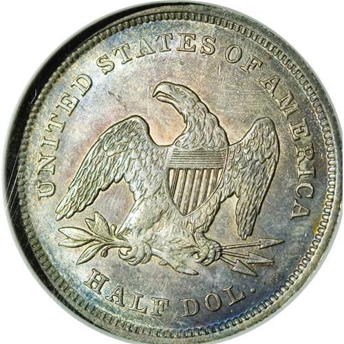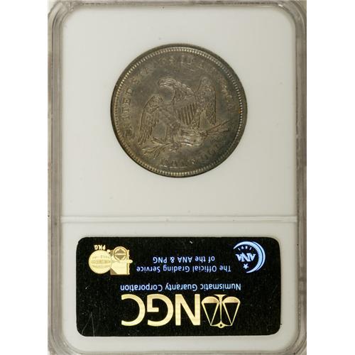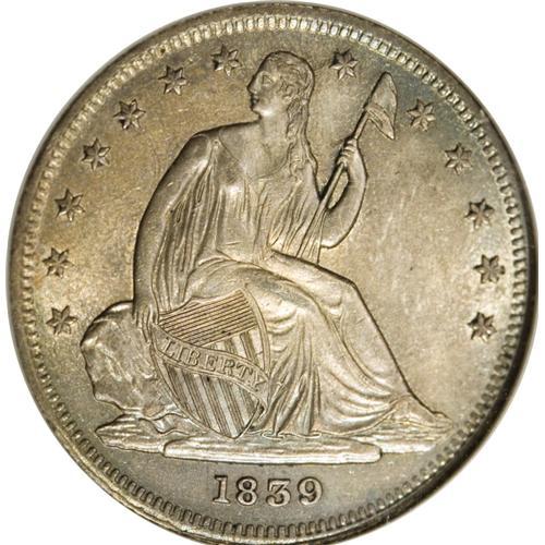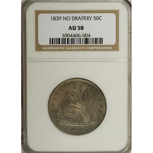 <B>1839 50C No Drapery AU58 NGC.</B></I> WB-101. This is the only date that features the No Drapery design in the Seated half series. It is distinctive from the With Drapery design in that the rock is smaller, thus increasing the distance between the rock and star 1. Generally not located finer than XF/AU, and rated as a Low R.4 in those grades. This particular coin shows strong striking definition. Each side is covered with lovely rose, lilac, and golden toning with noticeable traces of underlying mint luster seen beneath the color. Census: 29 in 58, 19 finer (1/07).<BR><BR><b>Shipping:</b> Coins & Currency (<a target="_blank" href="http://www.heritageauctions.com/common/shipping.php">view shipping information</a>)