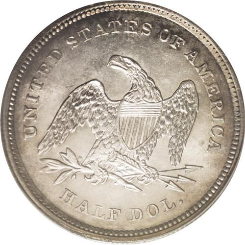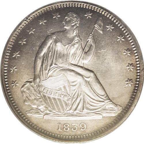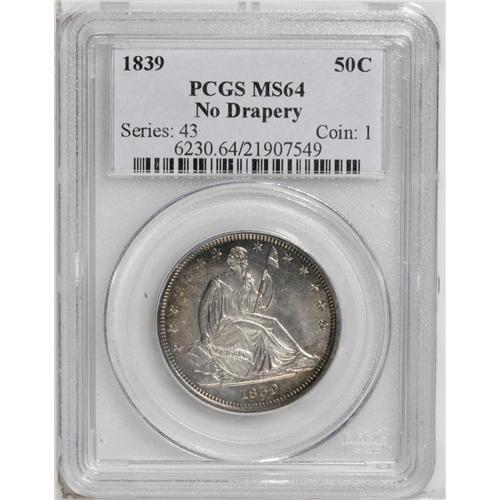 <B>1839<50C> No Drapery MS64 PCGS.</B></I> Breen-4743, WB-101. Mint Engraver Christian Gobrecht and artist Titian Peale designed the famous Flying Eagle reverse, launched in 1836 on the Gobrecht silver dollars that featured the Liberty Seated obverse. But when the half dollar was relaunched in 1839 with the Seated Liberty design, the reverse again featured the old Reich-style design, slightly updated and modified by Gobrecht, first used on the 1836 Capped Bust halves. This design change was implemented for some reason that is apparently lost, or was never documented in the first place, and clearly it was despite the express wishes of Mint Director Robert Maskell Patterson, who called the earlier eagle design, with the national shield affixed to its breast, "contrary to both art and nature."<BR> The first Seated Liberty half dollars lacked an extra fold of drapery at the elbow of Liberty. This rare piece is an example of the first Seated Liberty half dollar subtype. The large rock on the obverse is quite close to the lower-left star, and the 9 in the date is nearly closed. (Wiley and Bugert posit that when the extra folds of drapery were added beneath Liberty's elbow, the rock was made smaller to even out the metal flow.) On this coin's reverse there are only two butts to the arrows, despite three arrowheads! Two different obverse dies were used, but the exact number of No Drapery coins minted is unknown. Both the No Drapery and With Drapery 1839 halves are rare in Mint State, the No Drapery more so.<BR> This specimen offers light champagne-pink patination around the rims on each side, deepening to copper-gold in places, with brilliant, untoned silver centers. Under a loupe light roller marks can be seen on Liberty's torso, as well as at the rim beneath the date. A small hairline patch is seen on Liberty's left (facing) breast and arm. The strike is fairly well executed,