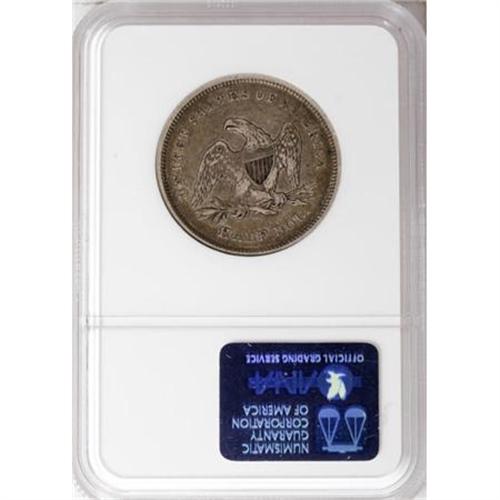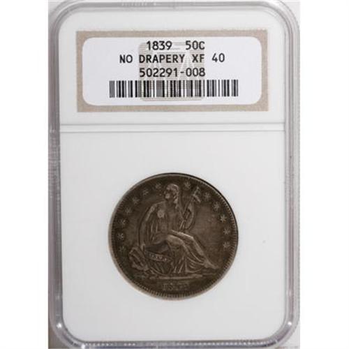 <B>1839 50C No Drapery XF40 NGC.</B></I> Softly struck on the eagle's talons, with moderate wear across the highpoints of the design. Deep brownish-gray toning blankets both sides of this XF example of the scarce No Drapery type.<BR><I>From The Casa Becca del Norté Collection.</B></I><BR><BR><b>Shipping:</b> Coins & Currency (<a target="_blank" href="http://www.heritageauctions.com/common/shipping.php">view shipping information</a>)