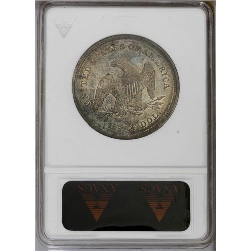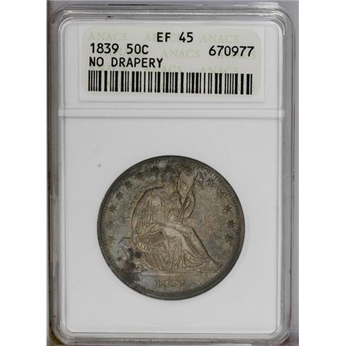 <B>1839<50C> No Drapery XF45 ANACS.</B></I> A sharp and partly lustrous piece with deep cobalt-blue and golden-brown toning. Some obverse verdigris is noted at 7:30. This introductory Seated half issue is important for type purposes, since all subsequent varieties display drapery beneath the elbow, except when removed by die polishing to remove clash marks.<BR><I>From The Steve Glenn Collection.</B></I> <BR><BR><B>Important notice:</B> Heritage usually auctions material at the rate of 200-250 lots per hour. On some occasions eBay Live bid software or the Internet may not be able to keep up with the pace of the auction. We recommend placing a realistic absentee bid now as insurance to avoid disappointment. Occasionally the auctioneer may eliminate or reject an eBay Live bid, and the auctioneer may also reopen a lot after the close of the eBay live bidding (usually because we missed an audience bid), and may reject your bid even if it shows you as the winning bidder. By bidding via eBay Live, you agree that Heritage may award the lot to another bidder at its sole discretion under the circumstances described above or any other reasonable circumstances. Since eBay bids are not shown to us until we open the lot on the floor, we treat those bids just like floor bids. In most cases the floor responds before the eBay bid is presented to us, due to Internet lag time, so for consistency we have made it a policy that floor bids are always considered first over tie eBay live bids. Also please note that all Heritage lots purchased through eBay Live carry a 20% Buyer's Premium. Please make sure you read the Terms and Conditions before you bid. This lot is being auctioned in conjunction with a live floor auction by Heritage Galleries & Auctioneers. All final auction and invoice information will be supplied by Heritage Galleries & Auctioneers, and all other information should be considered preliminary. Lot:1982 <BR><BR><B>Winning Notification and Billing:</B> After the FINAL session in this auction is complete, Heritage will send e-mail and snail mail invoices. This process normally takes several days. All final auction and invoice information will be supplied by Heritage Galleries & Auctioneers, and all other information should be considered preliminary. <BR><BR>This auction will be conducted on a live auction floor and over the Internet through eBay Live. If you choose to place an absentee bid, please take a moment to <font color='#0000ff'><u><a href='http://pages.ebay.com/liveauctions/help/before/laabsentee.html'>learn how eBay Live absentee bidding works</a></u></font><font color='#000000'>