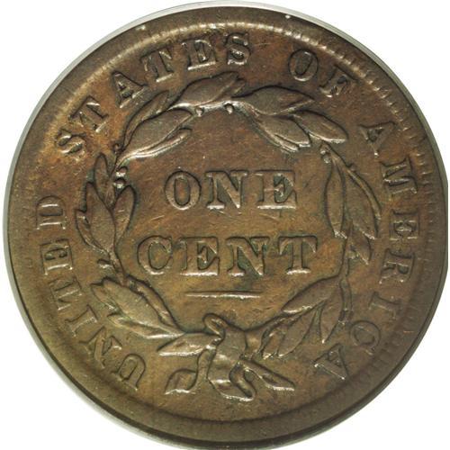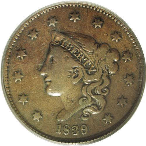 <B>1839/6<1C> VF20 PCGS.</B></I> N-1, High R.3. Noyes Die State C, which features a heavy horizontal bisecting obverse die crack. The sole Plain Cords variety, which is also noteworthy for the boldly recut final date digit. This golden-brown cent is nicely detailed, void of verdigris, and has no obtrusive marks. Housed in an old green label holder, and accompanied by an old collector's envelope. EAC 12.