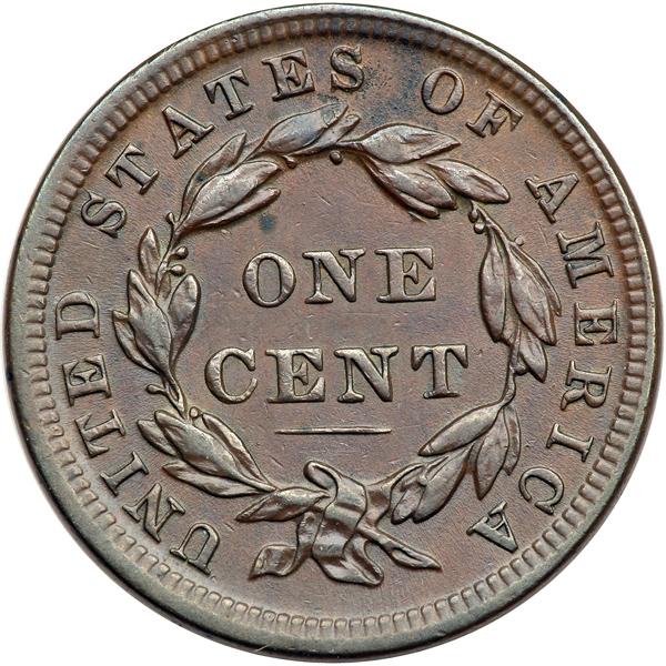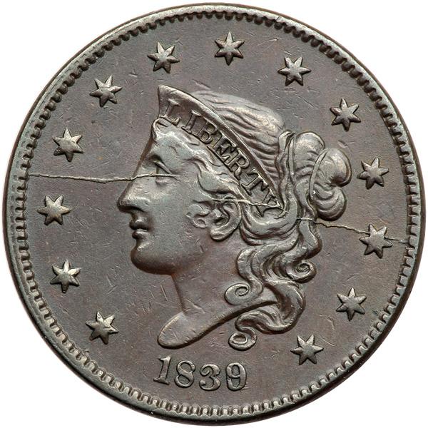 1839/6 Coronet Head Cent. PCGS graded EF-45. Choice glossy steel brown and chocolate, the reverse a few shades lighter than the obverse. The obverse is virtually flawless while the reverse shows a couple trivial defects, including a small spot of darker olive toning over the O in ONE and some extremely faint roughness at the second S in STATES extending to near the O in OF. LDS, Newcomb’s state III, with a strong die crack from the dentils under star 4 to the nose and eye plus another from the ear exiting the hair just below the hairbun through star 11 to the dentils at right. This example is sharp enough to see that the two die cracks are connected diagonally by a crack high on the cheekbone, thereby confirming this is a true bisecting die crack. A wonderful example of the impressive late die state, and both die cracks are bold. The overdate feature remains obvious. Called VF35 in the Bland census. Our grade is VF35. Pop 1; 1 in 53; 1 in 55; 1 in 58; 1 in 65. Only 5 graded at PCGS for the variety. DWH #3178 (PCGS # 37261) .
