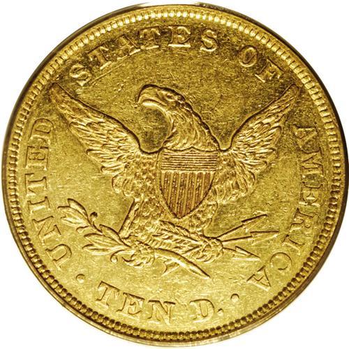 <B>1839/8 $10 Type of 1838, Large Letters XF45 PCGS.</B></I> The overdate variety as noted by PCGS, with traces of the previous 8 visible to the right of the outer curves of the digit 9. Pleasing light yellow-gold with myriad abrasions over reflective surfaces. An attractive and important example of this short-lived two-year design type.