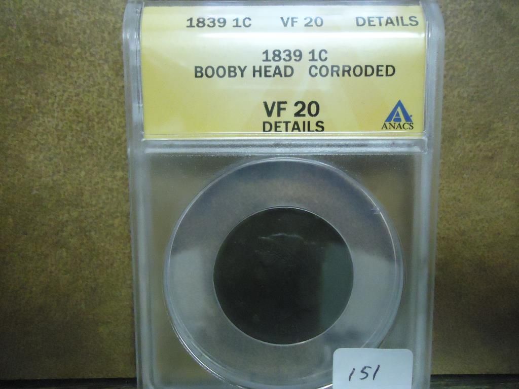 1839 BOOBY HEAD US LARGE CENT ANACS VF 20 DETAILS