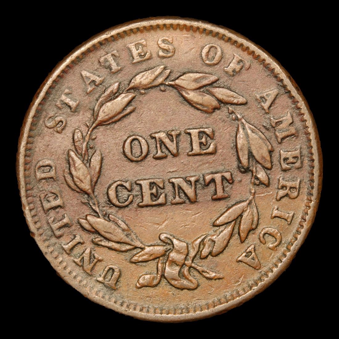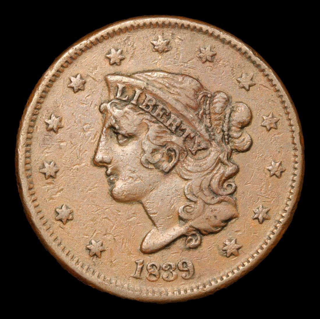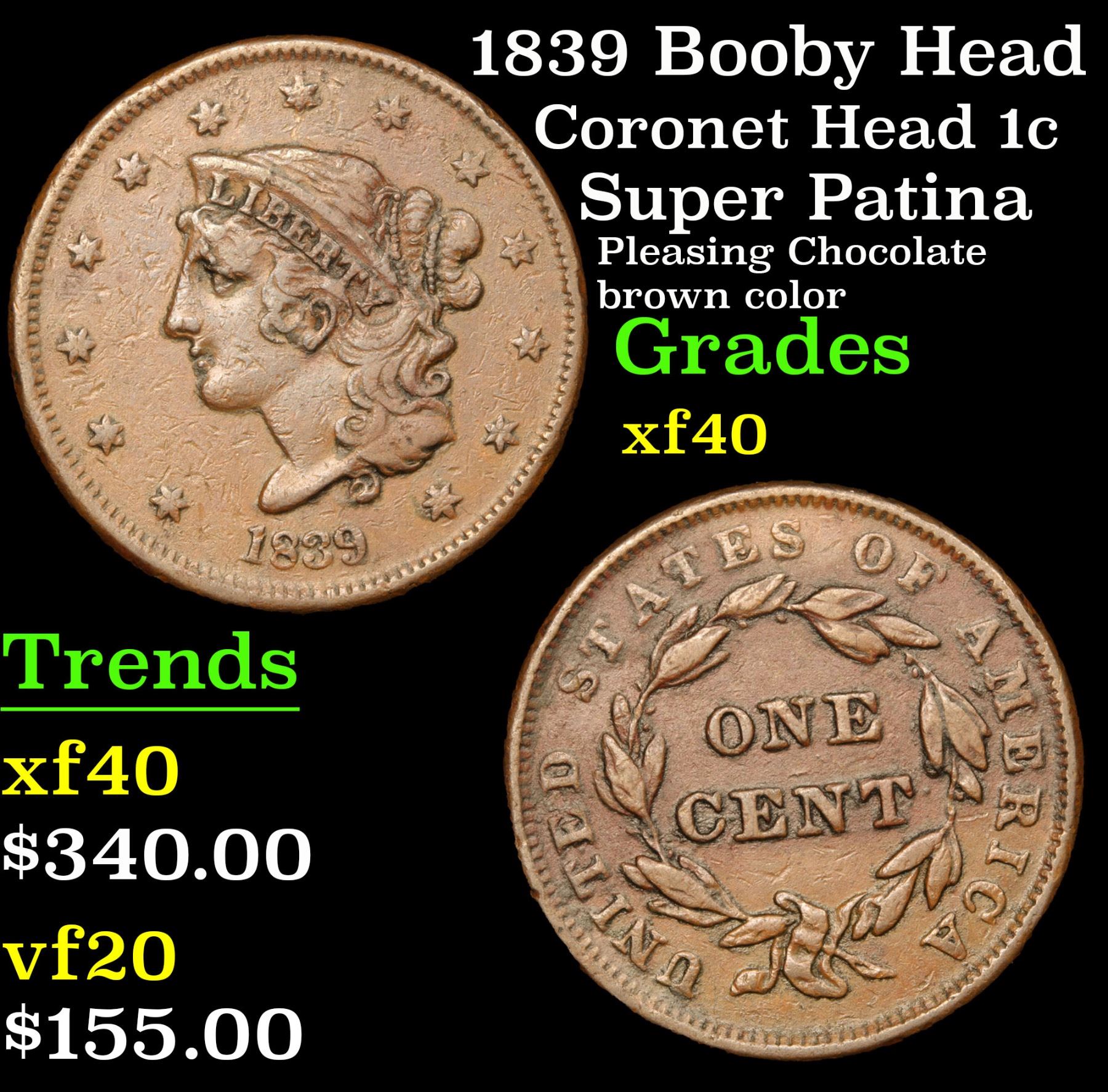 1839 Booby Head Coronet Head Large Cent 1c Grades xf. Super Patina; Pleasing Chocolate brown color
