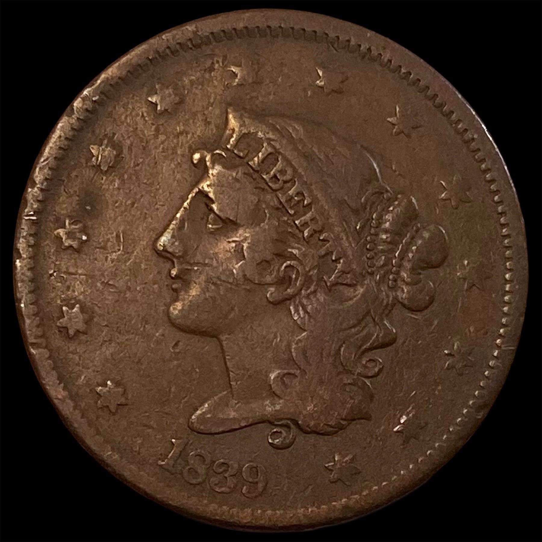 1839 Booby Head Coronet Head Large Cent NICELY CIRCULATED