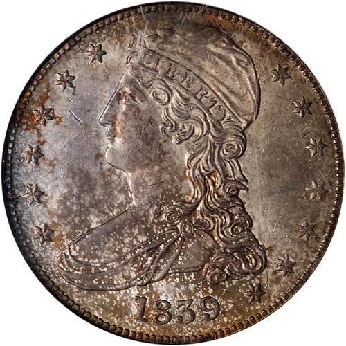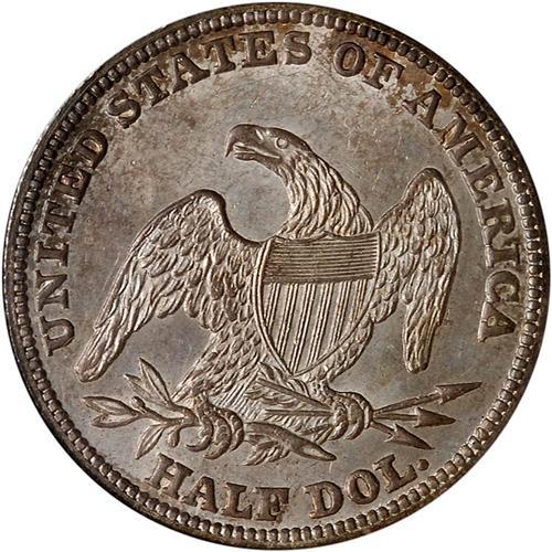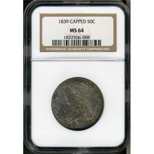 The second year of the two year type Capped Bust Reeded Edge Large Letters Reverse Half. Dol. From a mintage of one and a third million. Well struck up, the drapery knot and stars are all full and crisp. The obverse is mottled light and medium grey and the reverse light silver-grey. Bids $4650 and listed in CU at $8000.
