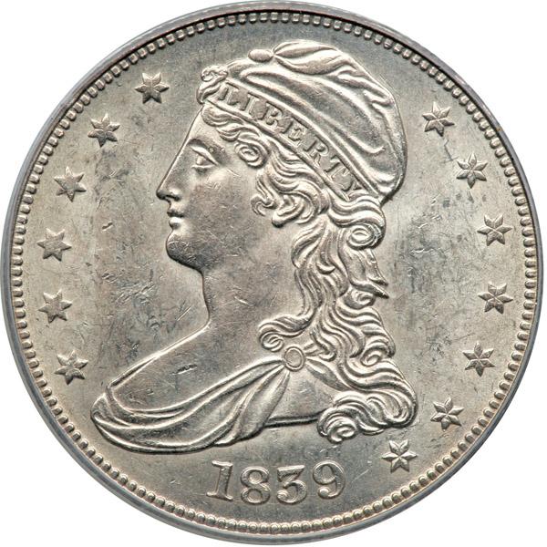 1839 Capped Bust Half Dollar Reeded Edge. PCGS graded AU-58. Frosty and white with close to 95% luster sill evident. Pop 38; 92 finer (PCGS # 6179) .