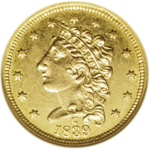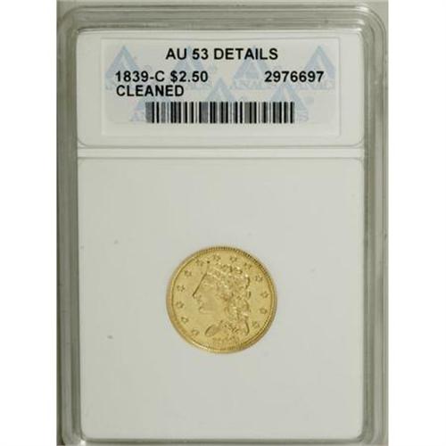 <B>1839-C $2 1/2 --Cleaned--ANACS. AU53 Details.</B></I> McCloskey-B, Breen-6149, R.4. The mintmark is small and centered between the bust and the top of the 3 in the date. On the reverse, the tip of the branch extends to the right edge of the upright of the D. Bright yellow-gold surfaces retain traces of luster in the recesses, and reveal some light hairlines under magnification. Good definition is noted on the design features. A scarce coin in AU, and quite rare in Mint State. A rather nice piece, despite the light cleaning.<BR><BR><b>Shipping:</b> Coins & Currency (<a target="_blank" href="http://www.heritageauctions.com/common/shipping.php">view shipping information</a>)