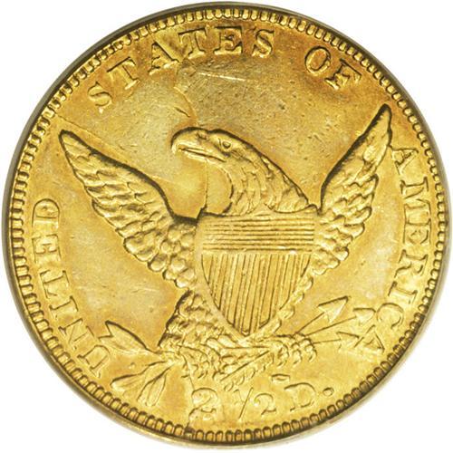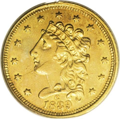 <B>1839-C<$2 1/2> AU55 PCGS.</B></I> Recut 39, Winter 3-C, McCloskey-C, Breen-6150, R.3. Lemon-gold and lilac-blue toning embraces this bright and splendidly detailed example. This variety was until recently regarded as an overdate, and it remains an interesting and obvious repunched date. The die state is also noteworthy for its heavy bisecting die cracks on both sides, and for the prominent wire rim on the upper right obverse. Population: 20 in 55, 8 finer (9/06).<BR><I>From The Tide Collection.</B></I>