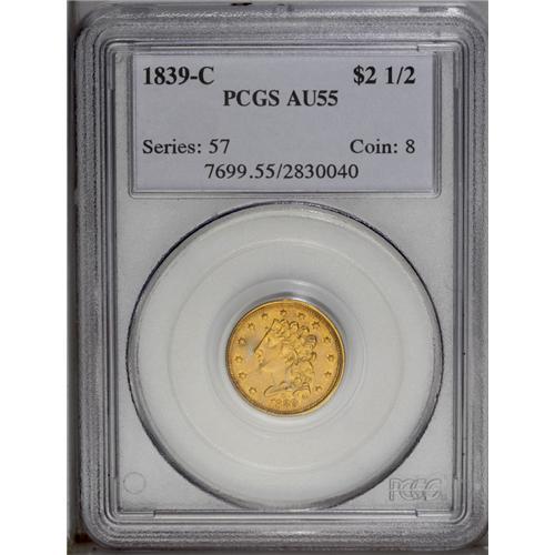 1839-C $2 1/2 AU55 PCGS. Recut 39, Winter 3-C, McClosk