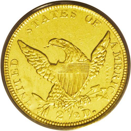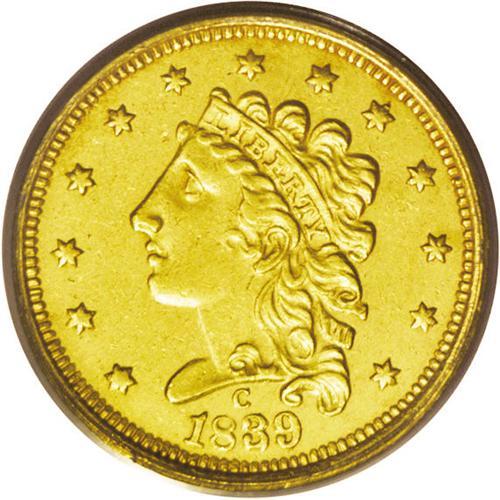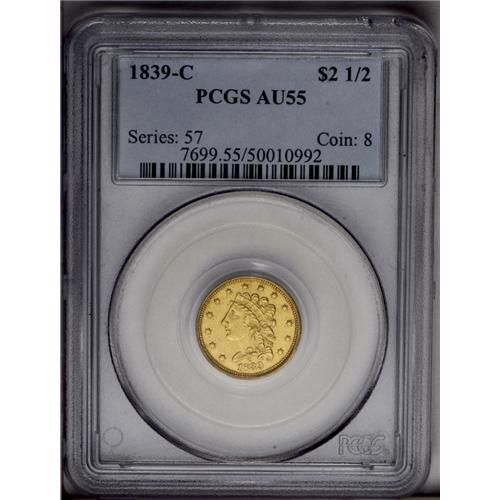 <B>1839-C<$2 1/2> AU55 PCGS.</B></I> Recut Date. Winter 3-C, McCloskey-C, Breen-6150, R.3. A well struck and subdued chestnut-gold example of this popular Charlotte issue. Struck from a median state of the dies, with die cracks to the beak and above the left (facing) wing, but without the eventual radial crack at 6:30. Population: 20 in 55, 5 finer (5/06).