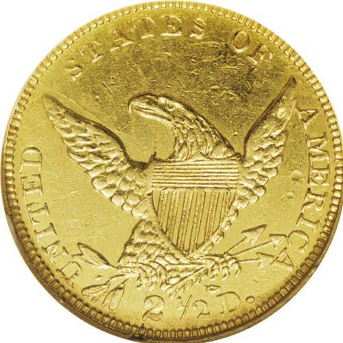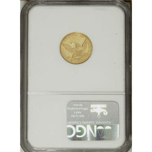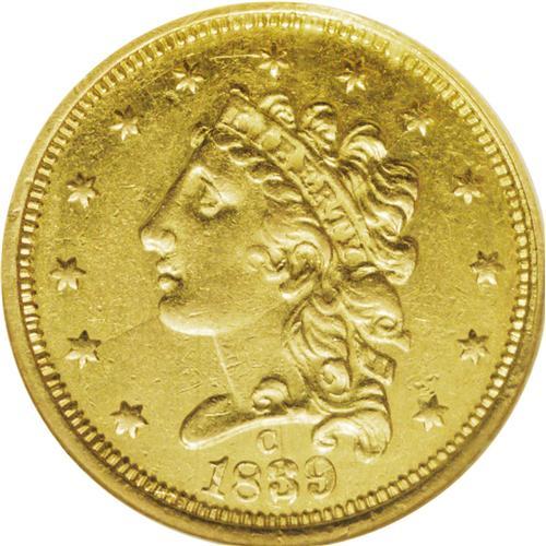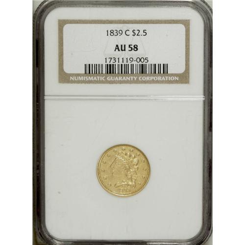 <B>1839-C $2 1/2 AU58 NGC.</B></I> Recut 39. Winter 3-C, McCloskey-C, R.3. Only 165-175 1839-C quarter eagles are believed extant today out of an original mintage of 18,140 pieces. AU pieces are very popular with collectors because of the Classic design and obverse mintmark. The devices on this piece are generally well defined, except for minor softness on the star centers. There are surprisingly few abrasions on either side; for pedigree purposes, we mention a tiny indention near star 6, and a couple of round abrasions under the E and R of AMERICA. A die crack travels from the upper left corner of the shield through the eagle's beak. Census: 62 in 58, 14 finer (11/06).<BR><BR><b>Shipping:</b> Coin/Currency (<a target="_blank" href="http://www.heritageauctions.com/common/shipping.php">view shipping information</a>)