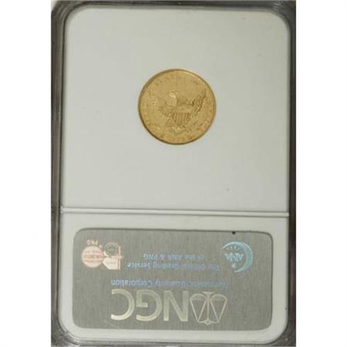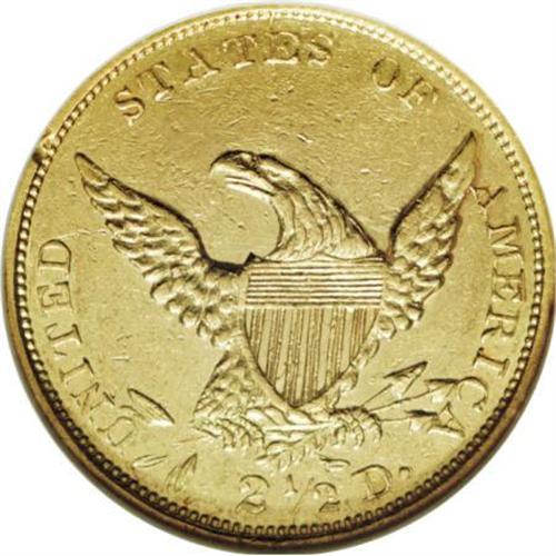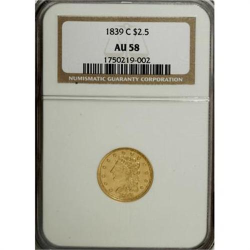 <B>1839-C $2 1/2 AU58 NGC.</B></I> McCloskey-B, Breen-6149, R.4. The mintmark is over the left half of the 3 in the date, and the branch stem tip is over the left edge of the D in the denomination. A later die state, indicated by a crack from the rim through the upright of the E in STATES and into the field above the eagle's head. There is a large mint-made defect on the cheek of Liberty. Douglas Winter, in his <I>Gold Coins of the Charlotte Mint</B></I>, posits this is probably a result of a foreign deposit adhering to the die during the striking process.<BR> The 1839-C is plentiful in Very Fine and Extremely Fine, very scarce in high-end About Uncirculated, and rare in Mint State. This AU58 example displays bright yellow-gold surfaces that reveal an even distribution of inoffensive ticks. The design elements are well brought up, save for softness in the star centrils. Census: 64 in 58, 16 finer (10/07).<BR><BR><B>Coin Engraver:</B> William Kneass<BR><BR><b>Shipping:</b> Coins & Currency (<a target="_blank" href="http://www.heritageauctions.com/common/shipping.php">view shipping information</a>)