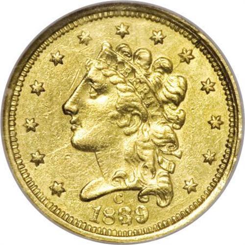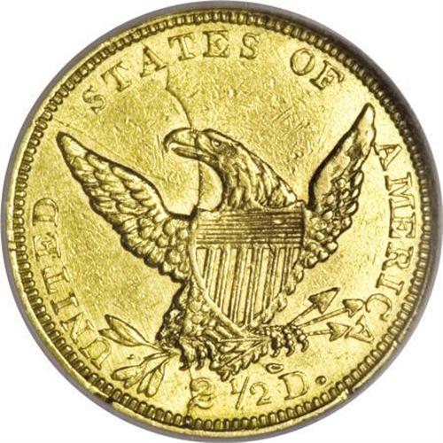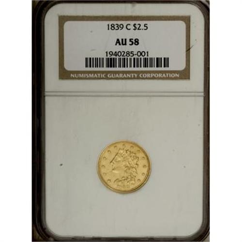 <B>1839-C $2 1/2 AU58 NGC.</B></I> Variety 3-C, McCloskey-C, Breen-6150, R.3. Recut Date. The obverse is identified by the recut 39 in the date, and the position of the mintmark, centered over the space between the 8 and 3. Both dies are shattered with extensive die cracks. An obverse crack bisects the die from star 2 to the chin, hair curls, and star 9. with another past the right side of the C, and up to the first crack. The reverse has several cracks, including one through the field over the left wing, and another bisects the die through the eagle's head. A pleasing greenish-gold representative with sharp design elements and bright, satiny luster.<BR><BR><B>Coin Engraver:</B> William Kneass<BR><BR><b>Shipping:</b> Coins & Currency (<a target="_blank" href="http://www.heritageauctions.com/common/shipping.php">view shipping information</a>)
