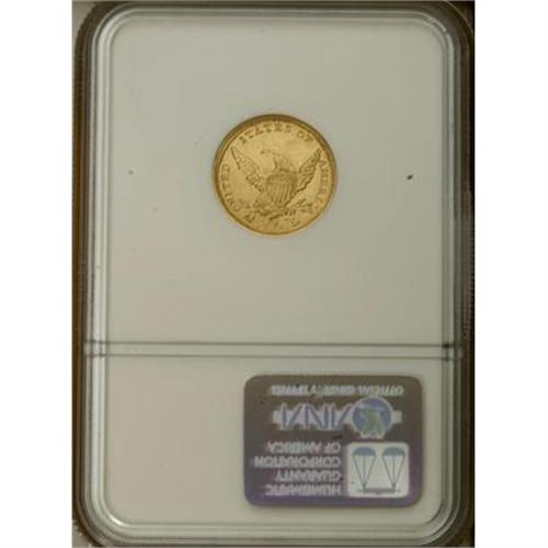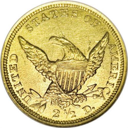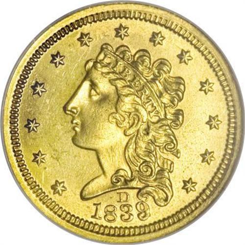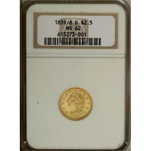 <B>1839/8-D $2 1/2 MS62 NGC.</B></I> Variety 1-B, R.4. The initial Dahlonega Mint quarter eagle, the 1839-D is also noteworthy as the only Classic quarter eagle issue from the famous southern branch mint, and thus the only date of the denomination with hand-punched design elements aside from the date and mintmark. Variety 1-B is scarcer than 1-A, and is noted for the arrowheads firmly touching the final letters in AMERICA. The strike is quite sharp, and only the most demanding collector would observe that the first three vertical shield stripes do not have complete separation. The straw-gold surfaces are fully lustrous. Scattered tiny planchet flakes are of mint origin, with a few luster grazes that define the grade. Census: 1 in 62, 5 finer (12/07).<BR><BR><B>Coin Engraver:</B> William Kneass<BR><BR><b>Shipping:</b> Coins & Currency (<a target="_blank" href="http://www.heritageauctions.com/common/shipping.php">view shipping information</a>)
