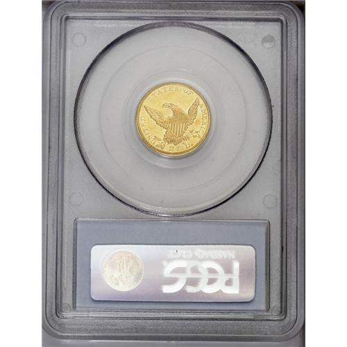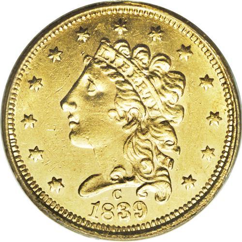 <B>1839-C<$2 1/2> MS62 PCGS.</B></I> Recut 39, Breen-6150, Winter 3-C, McCloskey-C, R.3. A radiant yellow-gold example with fewer marks than expected of the grade. Well struck aside from the stars. The usual die state for Variety 3-C, with two lengthy thin die cracks across the upper left reverse. As of (8/06), PCGS has certified only three 1839-C quarter eagles as Mint State. This example is one of two certified as MS62, with none finer. (The other piece is listed under the overdate PCGS number). For several years, the present die variety was believed to be an 1839/8 overdate, probably because the recutting on the 9 in the date does not appear to match the overdigit. Once it was realized this "overdate" was seen on all three branch mint issues for the date, as well as on 1839 Philadelphia quarter eagles, specialists concluded that a defective punch caused the appearance of an overdate. Although a different punch was used, a defective punch is also likely responsible for the 1839 Large Letters eagle. The latter, however, remains listed in the <I>Guide Book</B></I> as an overdate.