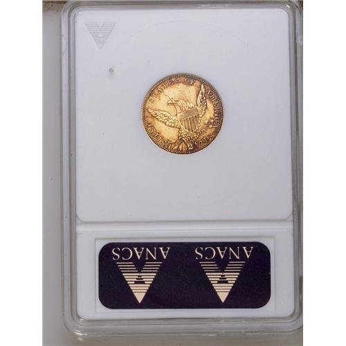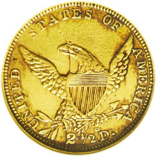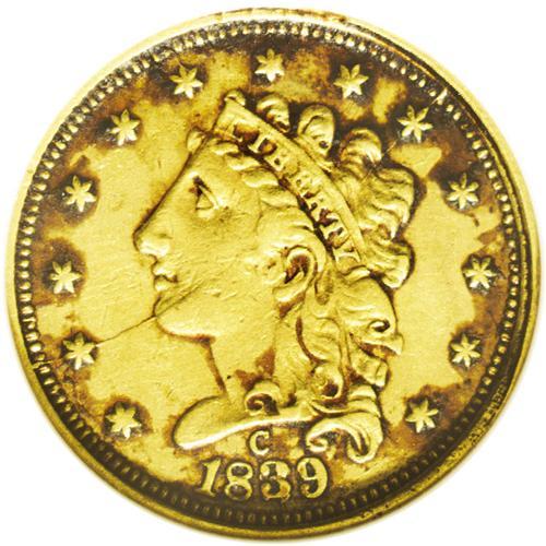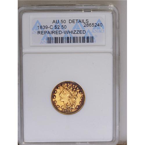 <B>1839-C<$2 1/2>--Repaired, Whizzed--ANACS. AU50 Details.</B></I> Recut 39, Variety 3-C, McCloskey-C, Breen-6150, R.3. Bold die breaks pass through the 3 in the date, through star 2 to Liberty's face, and from the T in LIBERTY to star 9. On the reverse, die breaks run radially from the left corner of the shield to the A in STATES, above the eagle's left (facing) wing, and down through the 2 in the denomination. The obverse field has been smoothed and whizzed to hide the "repair," with dark, artificial-looking buildup around the devices.
