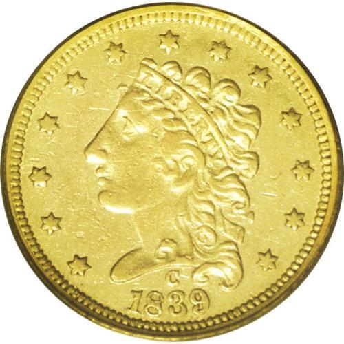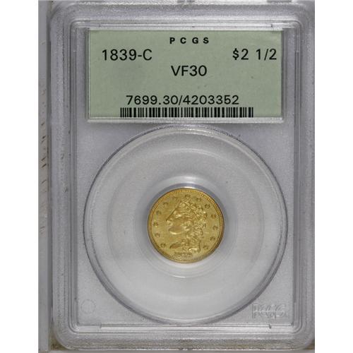 <B>1839-C<$2 1/2> VF30 PCGS.</B></I> Breen-6149, McCloskey-A, Winter 2-A, R.6. The rarest of the three known die marriages for this final C-mint Classic quarter eagle. Liberty's portrait is bold and displays substantial luster, while the eagle's neck and wings display wear. Just 18,140 pieces were struck. Housed in a green label holder.