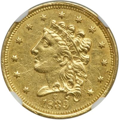 1839-C $2.50 Classic Head. NGC graded AU-55. Untoned example. 18,140 pieces struck. A lustrous matte-like specimen with resilient underlying luster around and within some of the devices and light golden highlights. From center to periphery, the coin is generally well struck with no hint of weakness at the eagle's neck. Several die cracks noted on either side. The most dramatic extends from the lower reverse rim, just touching the left edge of the 2 in the denomination, up through the eagle and left shield corner through the beak. How this die kept striking coins is a mystery! A very attractive example of an historic Charlotte Mint issue. Pop 37; 89 finer. (PCGS # 7699).