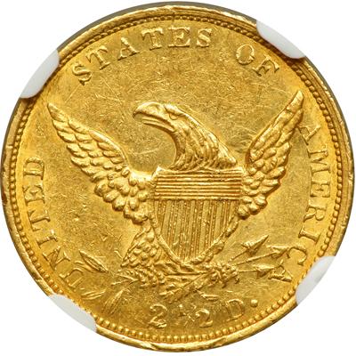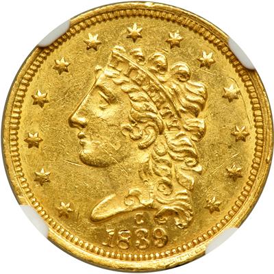 1839-C $2.50 Classic Head. . Ex Ashland City (Heritage Jan. 2003). NGC graded MS-61. Only 18,140 minted. Extensive die cracks are seen on each side, indicating this is probably the terminal state for this die. The surfaces are bright and satiny with just a hint of semi-reflectiveness in the fields, a result of die striations that can be seen with magnification. Sharply defined in the centers, the peripheral stars are also better defined than usual. Numerous light abrasions are scattered over each side and account for the grade, but the light green-gold color of the coin shows little of the reddish patina so often encountered. Pop 9; 2 in 62; 1 in 63. In a new NGC 4 pronged holder (PCGS # 7699).