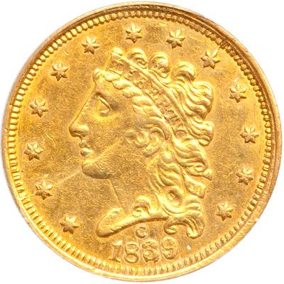 Historic note: The story of the Charlotte, North Carolina Mint begins with the discovery of gold in that part of the country. As the area grew in both wealth and prestige, there was soon agitation on the part of North Carolina's congressional delegation to establish a branch of the United States Mint at Charlotte, the seat of Mecklenburg County. From 1838 to 1861 (when it was closed permanently at the start of the Civil War) Charlotte struck gold coins exclusively, in denominations of $1, $2.50, and $5. Mintage tended to be low in most years, with 1838-C and 1839-C distinctive for their head style and placement of the mintmark on the obverse (above the date), as well as for their rarity.