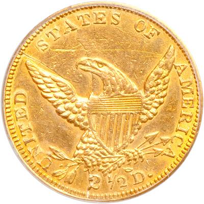 1839-C $2.50 Classic Head. PCGS graded AU-55. Lovely golden toning. Only 18,140 pieces struck. This date is notable for two features visible to the naked eye: extensive die cracks running hither and yon on both sides (how could the dies have kept together!), and multiple cuttings on the 39 of the date. We note a light hairline across the open space above the eagle. Luster in all protected areas. While a relatively common coin in worn grades, the '39-C is very elusive in solid AU55 condition with few pieces known (PCGS # 7699) .