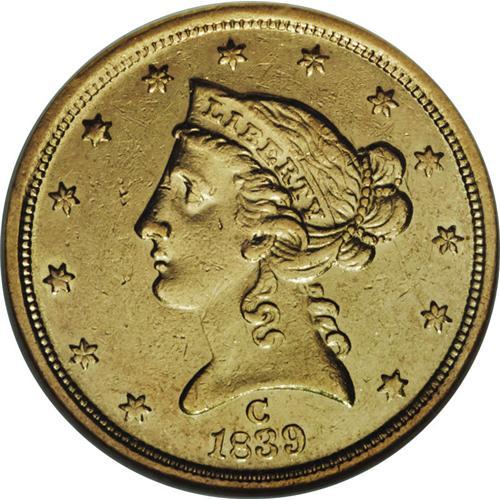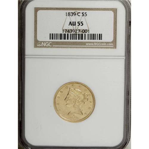 <B>1839-C $5 AU55 PCGS.</B></I> Variety 1-A. The 'C' mintmark for Charlotte lasted only two years, but those two years saw two different designs for the half eagle. The first was the Classic Head, for which 1838 was the final year. In 1839, the Gobrecht design made its debut, and the very next year, the mintmark was moved to the reverse, which created yet another variety. This piece has minor highpoint wear and delicate, frosty luster at the periphery. Solidly struck and appealing overall with a few scattered abrasions in the pale greenish-gold fields.<BR><BR><b>Shipping:</b> Coin/Currency (<a target="_blank" href="http://www.heritageauctions.com/common/shipping.php">view shipping information</a>)