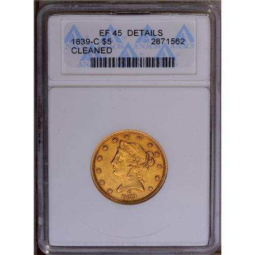 <B>1839-C<$5>--Cleaned--ANACS. XF45 Details.</B></I> Variety 1-A. A scarce and desirable obverse-mintmark date for Charlotte gold. The unusual yellow-gold coloration is the result of a cleaning that also left hairlines on much of the lower obverse. Still, this piece is more detailed than is typical for the issue.