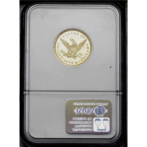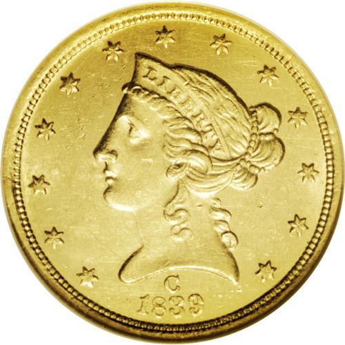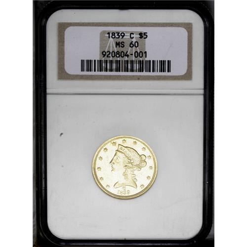 <B>1839-C<$5> MS60 NGC.</B></I> Variety 1-A. Bright yellow-gold throughout and attractive for the modest Mint State grade. There are minor surface hairlines which account for the grade and scattered ticks from handling. Rather sharp on the devices, with most of the definition present on Liberty's curls and the eagle's feathers. On the reverse, there is a minor rim break above STA of STATES which is seen above the dentils and does not affect the devices. For the year 1839, the Charlotte Mint coined 17,025 half eagles, and this is certainly one of the better examples to survive. It is currently within the top 20 graded by both services, and would be a prize for the Charlotte or half eagle specialist to obtain. The C mintmark is clear and resides in the area beneath Liberty's head above the date. The obverse mintmark feature proved unpopular with someone of importance, and by 1840 the branch mint coins were identified by the reverse die instead of the obverse, at least for the next few generations. <BR><BR><B>Important notice:</B> Heritage usually auctions material at the rate of 200-250 lots per hour. On some occasions eBay Live bid software or the Internet may not be able to keep up with the pace of the auction. We recommend placing a realistic absentee bid now as insurance to avoid disappointment. Occasionally the auctioneer may eliminate or reject an eBay Live bid, and the auctioneer may also reopen a lot after the close of the eBay live bidding (usually because we missed an audience bid), and may reject your bid even if it shows you as the winning bidder. By bidding via eBay Live, you agree that Heritage may award the lot to another bidder at its sole discretion under the circumstances described above or any other reasonable circumstances. Since eBay bids are not shown to us until we open the lot on the floor, we treat those bids just like floor bids. In most cases the floor responds before the eBay bid is presented to us, due to Internet lag time, so for consistency we have made it a policy that floor bids are always considered first over tie eBay live bids. Also please note that all Heritage lots purchased through eBay Live carry a 20% Buyer's Premium. Please make sure you read the Terms and Conditions before you bid. This lot is being auctioned in conjunction with a live floor auction by Heritage Galleries & Auctioneers. All final auction and invoice information will be supplied by Heritage Galleries & Auctioneers, and all other information should be considered preliminary. Lot:2652 <BR><BR><B>Winning Notification and Billing:</B> After the FINAL session in this auction is complete, Heritage will send e-mail and snail mail invoices. This process normally takes several days. All final auction and invoice information will be supplied by Heritage Galleries & Auctioneers, and all other information should be considered preliminary. <BR><BR>This auction will be conducted on a live auction floor and over the Internet through eBay Live. If you choose to place an absentee bid, please take a moment to <font color='#0000ff'><u><a href='http://pages.ebay.com/liveauctions/help/before/laabsentee.html'>learn how eBay Live absentee bidding works</a></u></font><font color='#000000'>