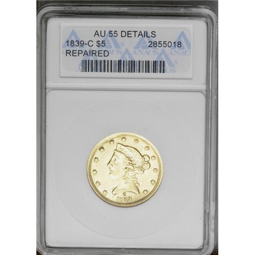 <B>1839-C<$5>--Repaired--ANACS. AU55 Details.</B></I> Variety 1-A. Charlotte Mint type collectors need to consider the 1839-C. Unlike the other C-mint Liberty half eagle issues, the mintmark is located on the obverse, and Liberty's portrait differs noticeably. The obverse is thickly hairlined near the coronet tip and Liberty's shoulder, and the field is glossy and bright within those areas. The partly lustrous reverse has a few light hairlines but is otherwise unimpaired.