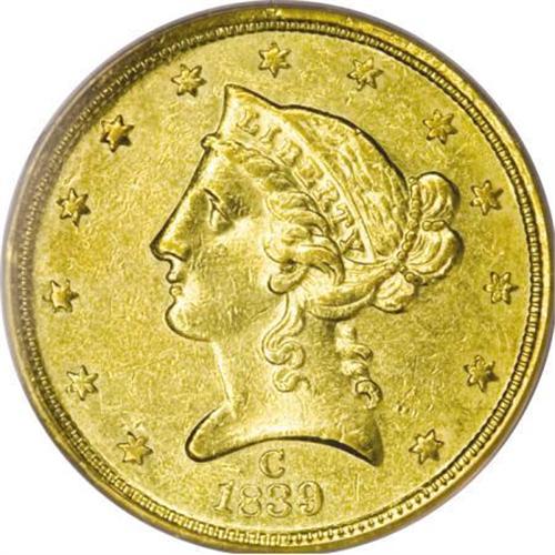 <B>1839-C $5 XF45 PCGS.</B></I> Variety 1-A. Well struck with all of the major details visible except for a few stars that lack their full radial lines. There are a number of small marks in the fields but none are obtrusive; a small scratch can be discerned to the left of the first S in STATES and there are a few light marks on the reverse rim. A good deal of luster is present and this suggests a higher grade than that assigned by PCGS. Some light yellow-gold color on both sides adds to the overall appeal. Housed in an old PCGS holder and conservatively graded by today's standards.<BR> Like the 1838-C, the 1839-C is a distinct one-year type and this has made it very popular with type collectors. This date is not really all that scarce but locating choice, problem-free examples in the XF45 to AU55 grade range is far more difficult than most collectors realize.<BR><I>From The Carolina Circle Collection.</B></I><BR><BR><B>Coin Engraver:</B> Christian Gobrecht<BR><BR><b>Shipping:</b> Coins & Currency (<a target="_blank" href="http://www.heritageauctions.com/common/shipping.php">view shipping information</a>)