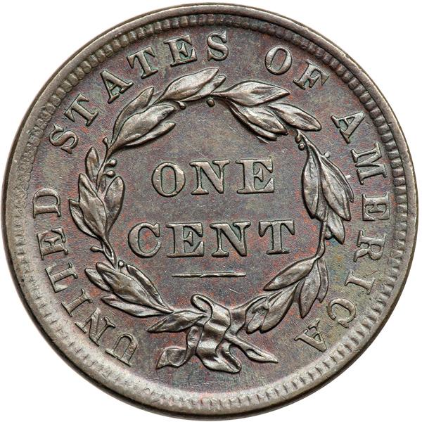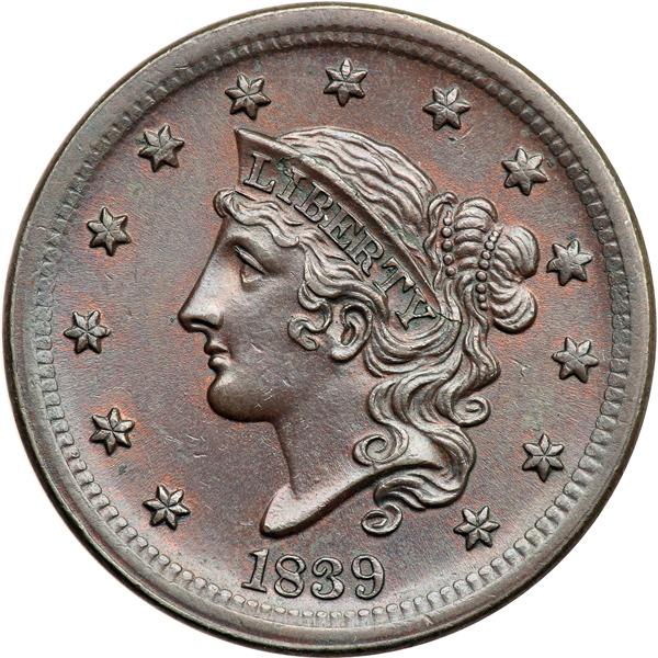 1839 Coronet Head Cent. PCGS graded MS-63 Brown. Frosty chocolate and bluish steel brown with generous traces of slightly faded mint color remaining. The only defect worthy of mention is a small, shallow planchet lamination through the upper half of the I in LIBERTY, as struck. E-MDS. A small horizontal dash shows between the bases of the 3 & 9 with a similar but slightly stronger one right of the base of the 9. Removed from an NGC slab graded MS64BN (NGC label included). Our grade is AU58. Pop 1; 1 in 64; 1 in 65; 1 in 65RB. Only 5 graded at PCGS for the variety. DWH #3184 (PCGS # 37231) .