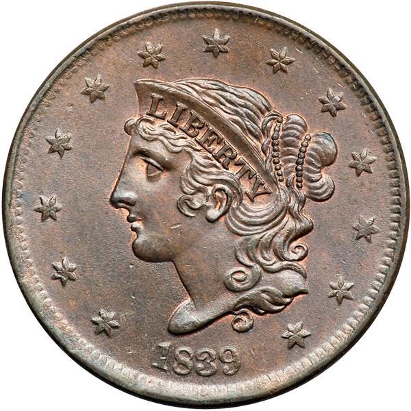 1839 Coronet Head Cent. PCGS graded MS-64 Brown. Lustrous light bluish steel brown with traces of mint red in protected areas. A tiny nick on the cheek, faint traces of an old fingerprint at star 8, and a speck of very light carbon at the dentils under the wreath are the notable defects, and all are trivial. LDS. The fields are covered with fine radial flowlines and the dentils are blurry. An attractive Booby Head cent. Purchased as a 65th birthday gift by wife Joan. Our grade is MS60+. Pop 1; 1 in 65; 2 in 66. Only 5 graded at PCGS for the variety. DWH #2274 (PCGS # 37237) .